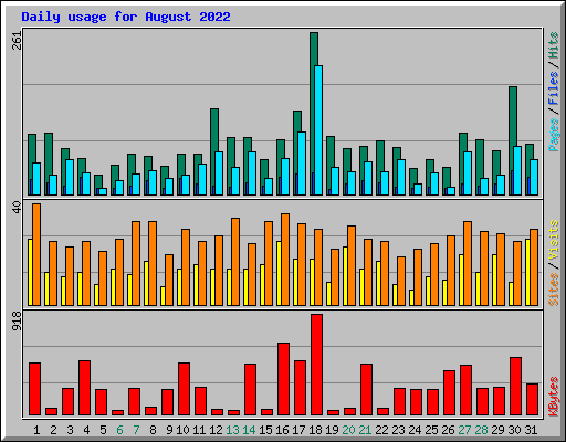 | Day | Hits | Files | Pages | Visits | Sites | KBytes | ||||||
